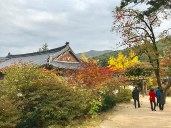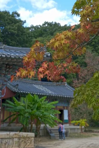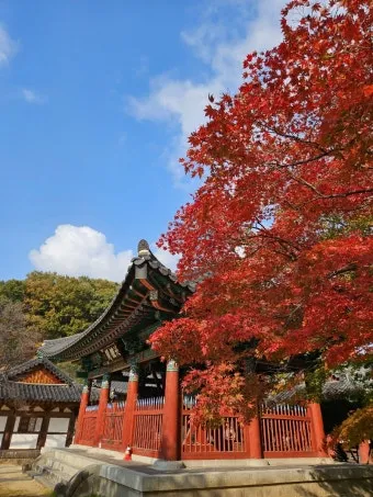 단풍이 들면 사찰 전체가 붉은빛과 노란빛으로 물들어서, 마치 한 폭의 동양화 속에 들어온 것 같은 느낌을 받게 됩니다. 특히 대웅전 앞마당에서 바라보는 풍경은 정말 압권이에요.