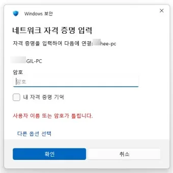 사용자 이름은 대상 컴퓨터의 로컬 계정명을 입력합니다. 도메인 환경이면 DOMAIN\username 형식으로 쓰면 되고요. 비밀번호는 당연히 해당 계정의 비밀번호를 입력하면 됩니다.