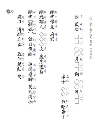- 아버지: 현고(顯考) 학생부군(學生府君)