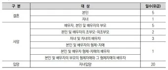 배우자 사망: 5일입니다. 법률혼 관계의 배우자에게만 적용됩니다.