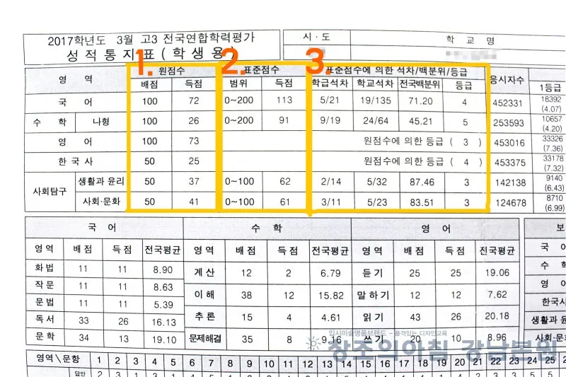 근데 한 가지 주의할 점이 있어요. 국어와 수학은 공통과목과 선택과목의 점수 조합에 따라 같은 원점수라도 표준점수가 달라질 수 있습니다.