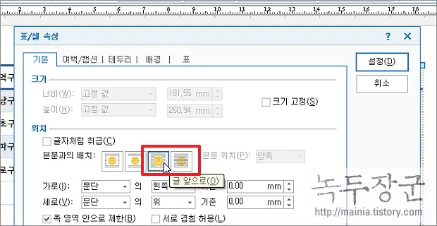한컴오피스 한글에서 표를 만들면 기본적으로 '글자처럼 취급' 옵션이 체크되어 있어요.